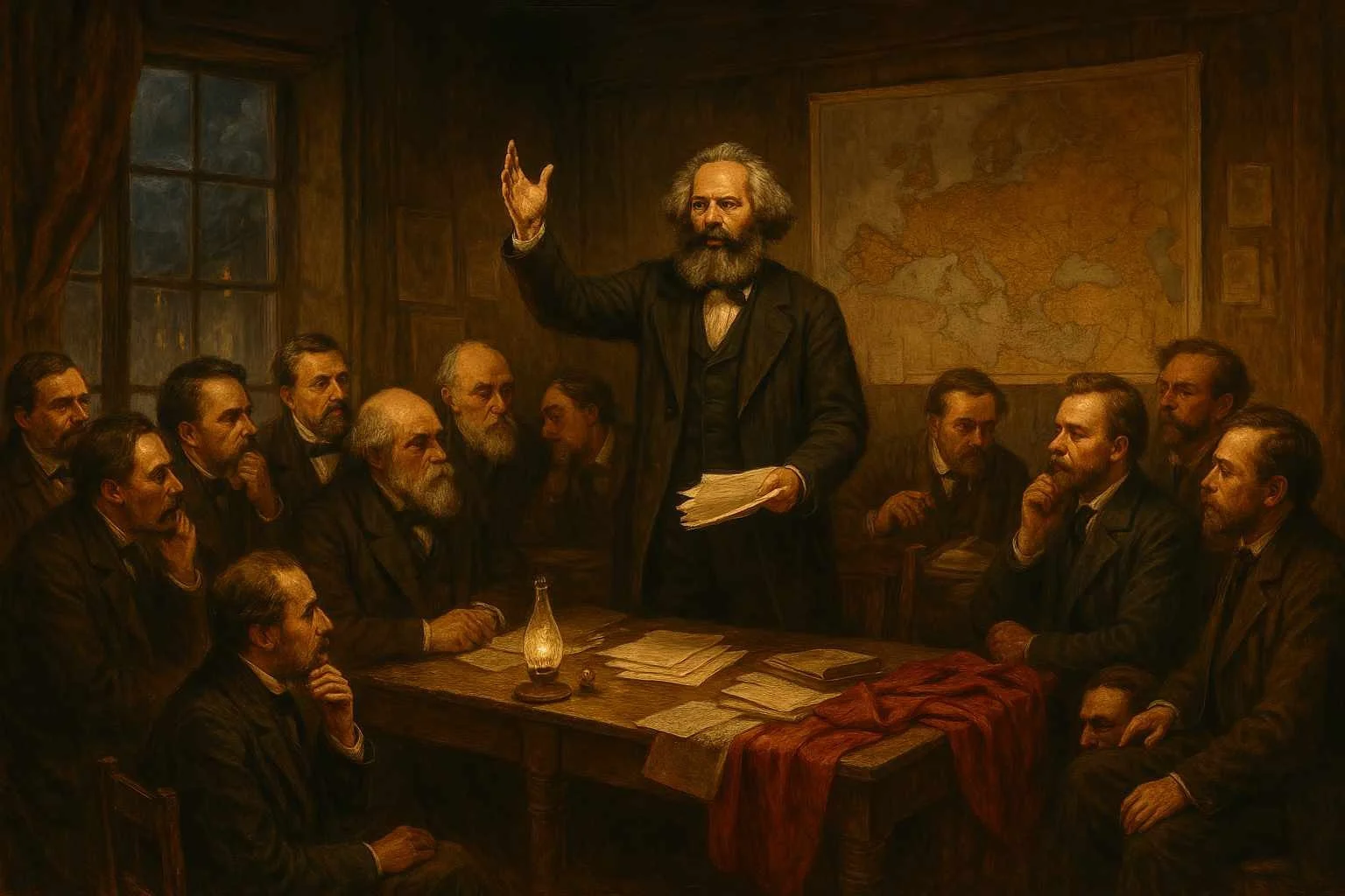 A bearded man in a suit speaks passionately, holding papers, in a dim room with a map on the wall. He is surrounded by seated men listening intently around a table with a lamp and documents.